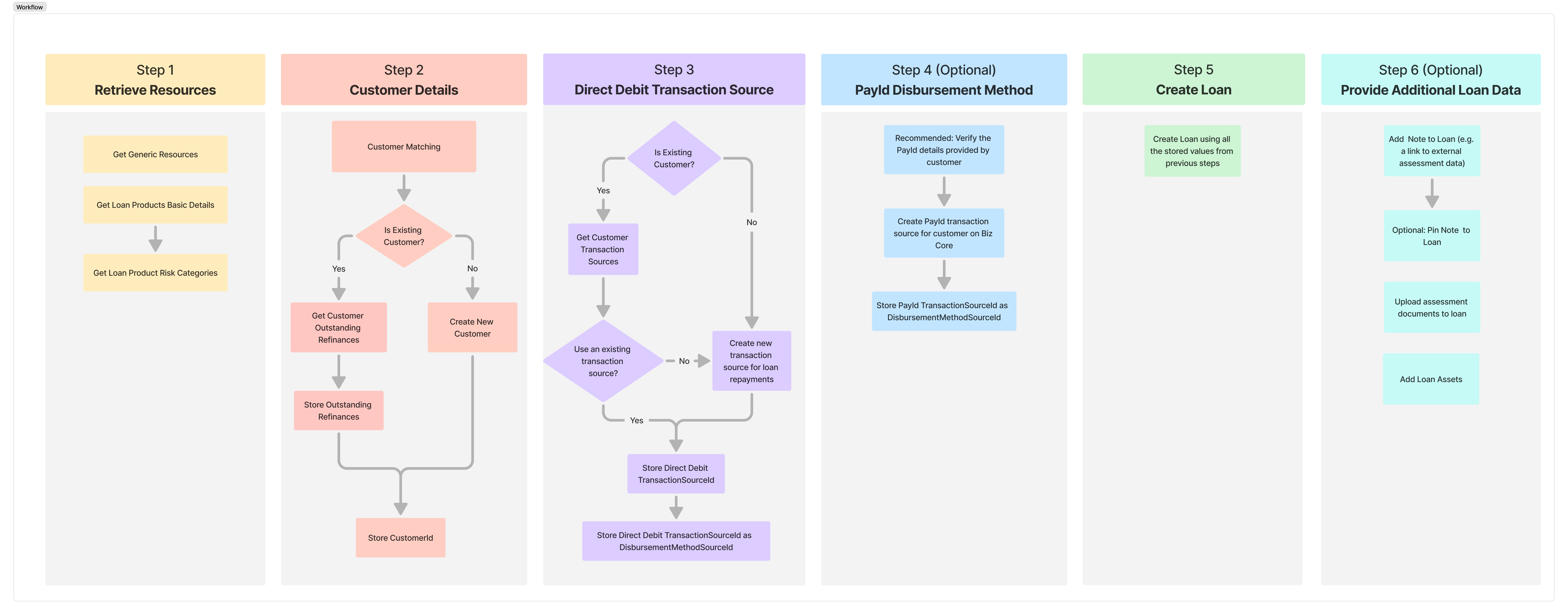 This guide outlines the end-to-end API process for creating a loan in Biz Core. It details each step in sequence, showing data dependencies and the logical flow between API calls.